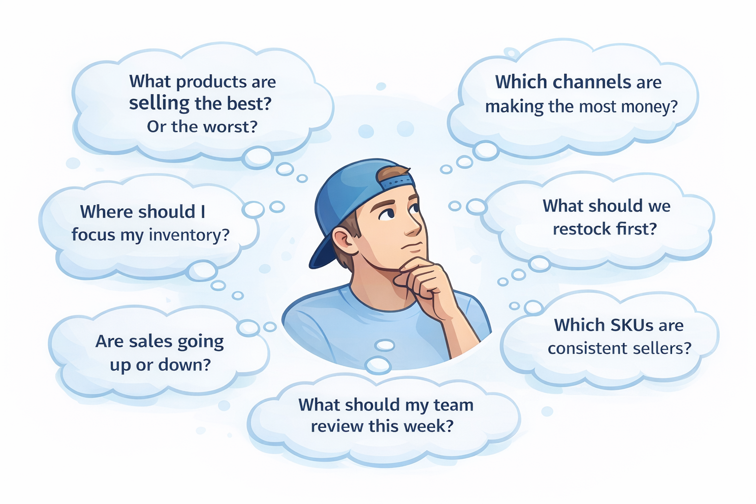 Every seller asks different questions of their data. Sometimes you need sales by channel. Other times, you need to drill down to the SKU level to understand what’s driving performance—or what’s stalled out.